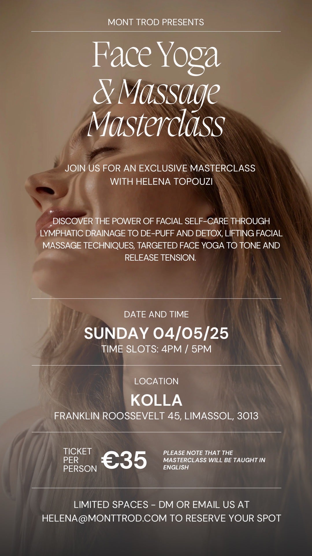Join our Founder Helena Topouzi in an exclusive masterclass to discover the power of facial self-care through lymphatic drainage, facial massage techniques and face yoga.